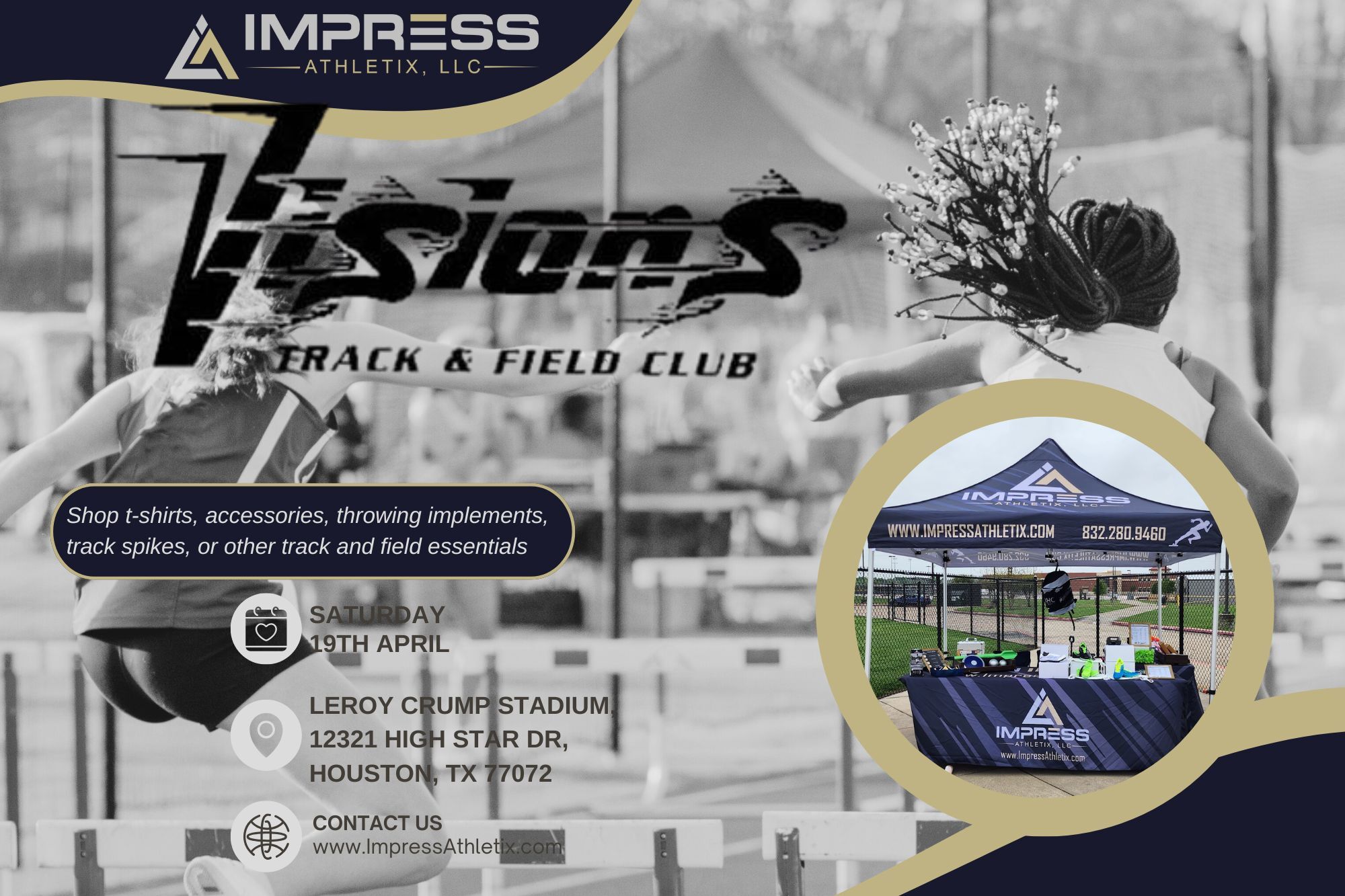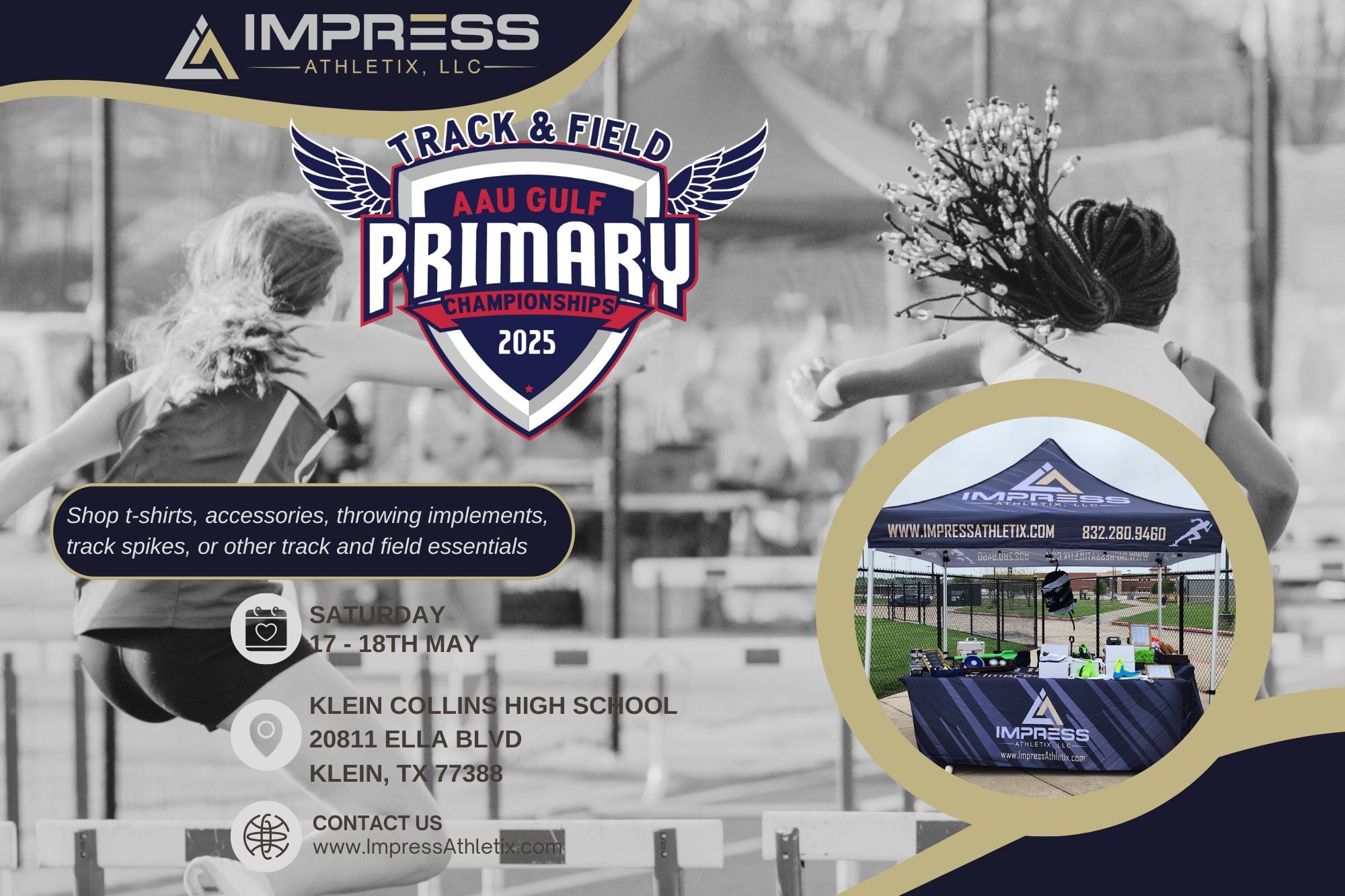 Impress Athletix will be on site. We will offer primary championship t-shirts, youth track spikes, omni-lite replacement spikes, throwing implements from Champro, Champion Sports Discus, Throwing Zone Athletics and Impress Athletix.