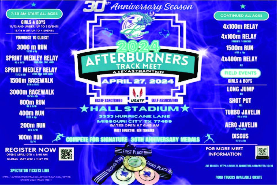 The 2024 Afterburners Track Meet will be held April 27, 2024 at Hall Stadium. Registration is open now.