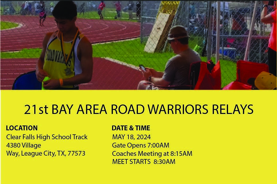 The 21st Bay Area Road Warriors Relays will be held May 18, 2024 at Clear Falls High School. Register on www.coacho.com.